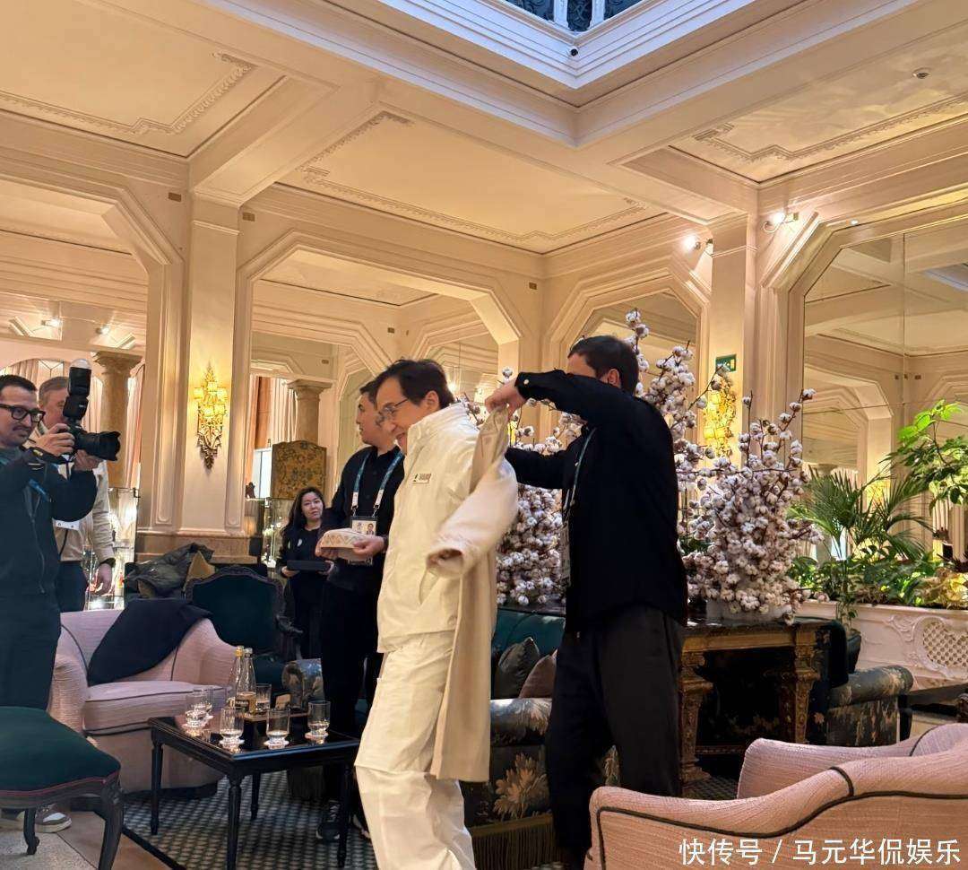 2. **米兰酒店那一幕:前呼后拥里,他依然会点头** 在米兰的豪华酒店,『成龙』偶然被人发现。画面中,他背对镜头坐着,四周围绕着一群工作人员,气氛热烈,大家讨论事务、相互打招呼、递送衣物,忙得像在招待亲友一样热闹。『成龙』穿着一套浅色衣服,缓步起身,脚步从容,回头时看到有人举起手机,他依旧面带笑容,轻轻点了点头。