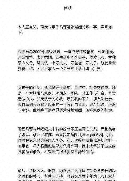 2016年8月14日的零点刚过,『王宝强』突然发布了一条措辞沉痛的离婚声明,这条声明像一把锋利的刀,瞬间切入公众的心里:本人配偶马蓉与经纪人宋喆长期保持不正当男女关系,并蓄意隐匿、转移夫妻共有资产。简短却犀利的文字,一下子撕开了外界对他家庭生活的美好幻想,也揭开了他私人世界的巨大裂痕。