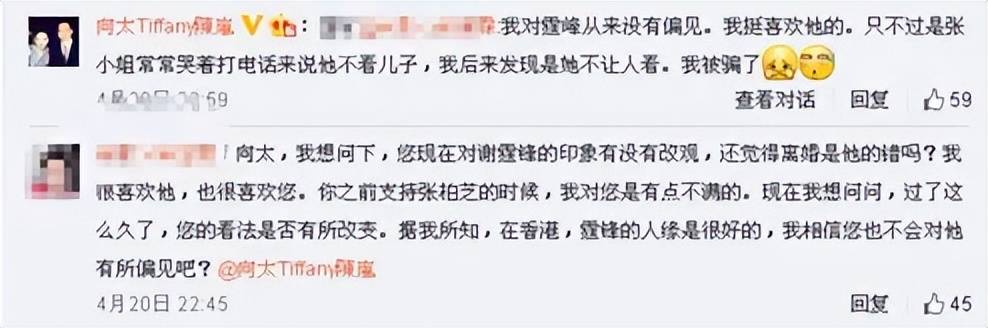 向太真正的态度转变,发生在和『张柏芝』解约后,曾“仗义执言”的她,亲切称呼『谢霆锋』为“霆锋”,并直言,自己对他从来没有偏见,反而很喜欢。