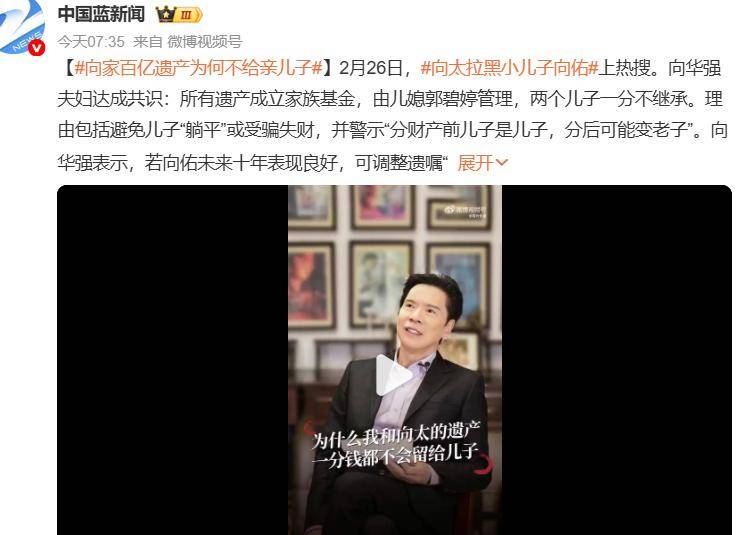 最近向家又活跃了起来,上了个关于遗产分配的热搜,原来是『向华强』在视频里直言要把遗产交给儿媳妇郭碧婷,不会留给两个儿子。