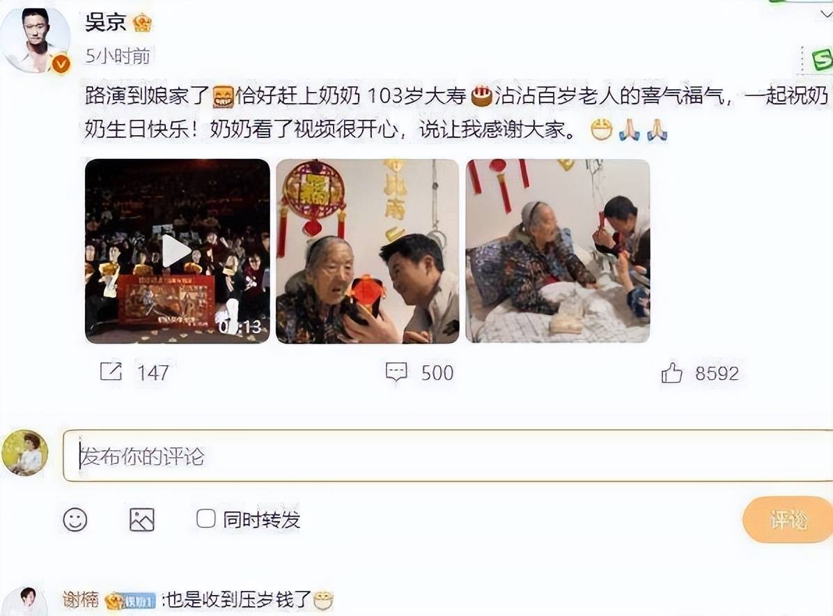 当全场齐声高喊生日快乐时,祝福的声音汇聚成一股暖流,场面温馨感人。工作结束后,『吴京』和谢楠一同来到奶奶家中探望。虽然奶奶已经年事已高,满头白发,脸上布满了岁月的痕迹,但她依然神采奕奕,精神矍铄。看到孙辈们前来探望,她脸上洋溢着幸福的笑容,仿佛岁月在这一刻静止了。『吴京』还特地将录制的祝福视频播放给奶奶看,并在『社交平台』上透露奶奶看完视频后非常开心,那份真挚的亲情让人动容。