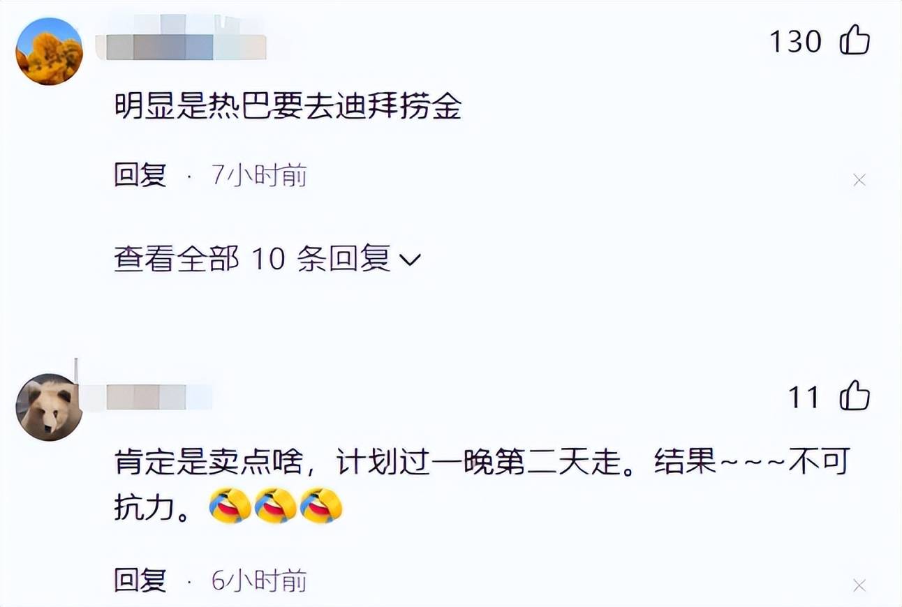 还有网友用自己的固有思维猜想,称『迪丽热巴』之所以要去阿联酋转机,是因为阿联酋的商务舱待遇最好,说她给工作人员买了直达机票,自己却享受了最好的机舱,所以工作人员都按时到了,她被滞留在了迪拜。