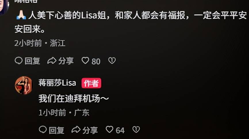 好在陈浩民一家凌晨顺利抵达了迪拜机场,并且IP地址也显示在了广东,不过蒋丽莎却表示目前一家人还在迪拜机场,希望他们能够平安归来。