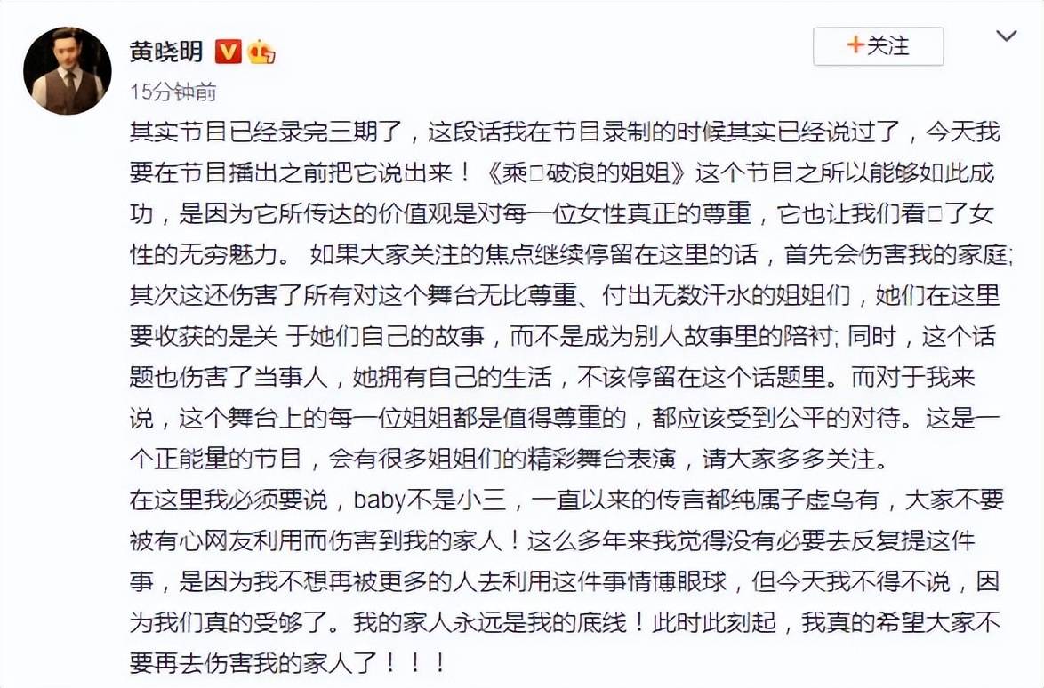 他发文说:baby不是小三,一直以来的传言都纯属子虚乌有,大家不要被有心网友利用而伤害到我的家人!我的家人永远是我的底线!