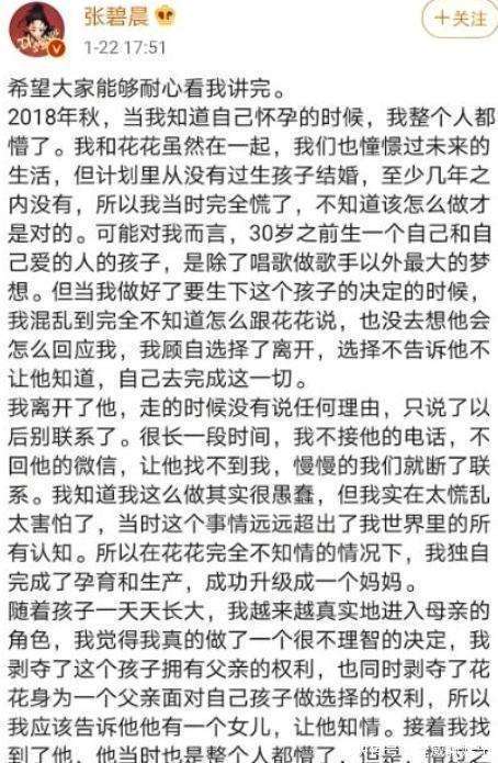 差不多同一时间,『张碧晨』也发了一篇长文,揭开了事情的真相。她在文章中说道,当初怀孕时,『华晨宇』根本不知道。当她自己发现怀孕后,心里慌得一批,因为她的计划里根本没有结婚生孩子这一项。这个突如其来的惊喜把她搞得手忙脚乱,完全乱了方寸。最终,『张碧晨』决定把孩子生下来,并且一个人悄悄跑到了国外,直到孩子出生后才回到国内。也就是说,『华晨宇』直到孩子已经一岁时,才知道自己成为了爸爸!这剧情,简直连编剧都不敢这么写吧?