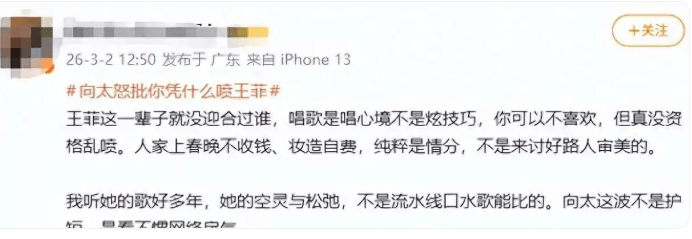 就在舆论持续发酵半个月后,3月1日,向太陈岚出手了。视频里的她情绪激动,语速很快。“这种现象让人很生气,”她开门见山。她认为,『王菲』选择这首歌根本不是技术问题,也不是为了炫技,而是在表达她当下“活在当下、内求放下”的修行心境。向太直言不讳地指出,很多批评者可能因为人生阅历和境界的局限,根本“听不懂”歌词里“百年长河不过此刻相遇”所蕴含的哲思。在她看来,这已经不是艺术讨论,而是“速评文化”下不负责任的跟风吐槽。