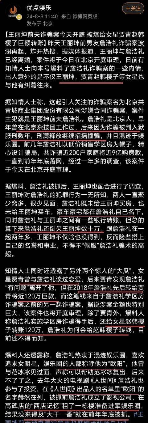 詹浩礼的前科让这一切变得更加扑朔迷离。结婚时恰逢他诈骗事业的高峰期,有人揣测,他是否利用从受害者那里骗来的钱,为『王丽坤』买了房子和豪车。最终,二人的婚姻走到了尽头。『王丽坤』工作室声明,称她与这桩诈骗案并无关系,二人聚少离多,最终『王丽坤』找了律师办理离婚手续,2024年正式离婚。詹浩礼的母亲更是录音称,『王丽坤』离婚是为了快速了结此事。网友们纷纷表示,『王丽坤』眼光实在太差,竟嫁给了这样的人。