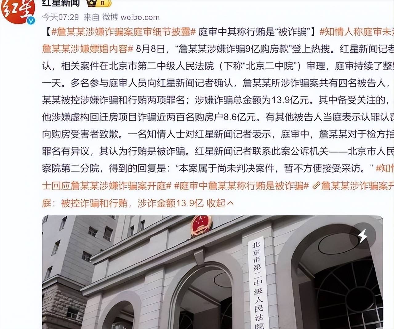 2024年8月,北京二中院开庭审理此案,詹浩礼承认了诈骗与嫖娼等罪行。受害者代表也出庭说明了自己的巨大损失。庭审结束后,案件进入判决阶段。2025年11月,警方通过阿里拍卖平台将詹浩礼的资产进行拍卖,虽然这些资产拍卖了超过1亿,但仍远远不足以弥补受害者的损失。
