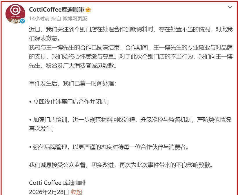 这件事一整天都在发酵,直到2月28日凌晨,库迪官方才在『社交媒体』上向『王一博』表达了歉意。