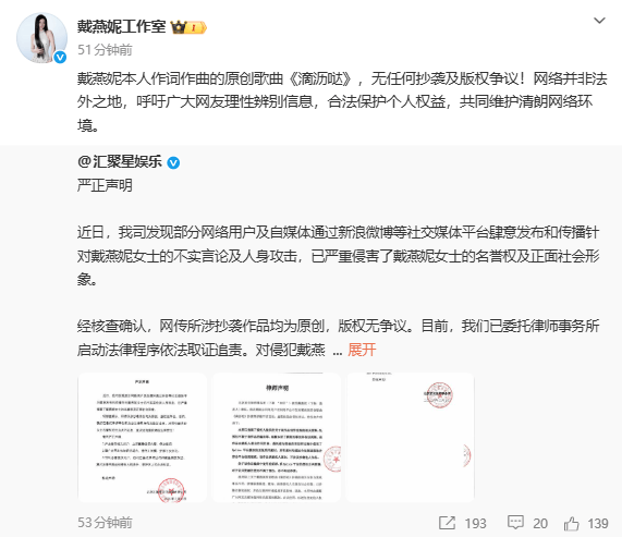“戴燕妮本人作词作曲的原创歌曲《滴沥哒》,无任何抄袭及版权©️争议!网络并非法外之地,呼吁广大网友理性辨别信息,合法保护个人权益,共同维护清朗网络环境。”