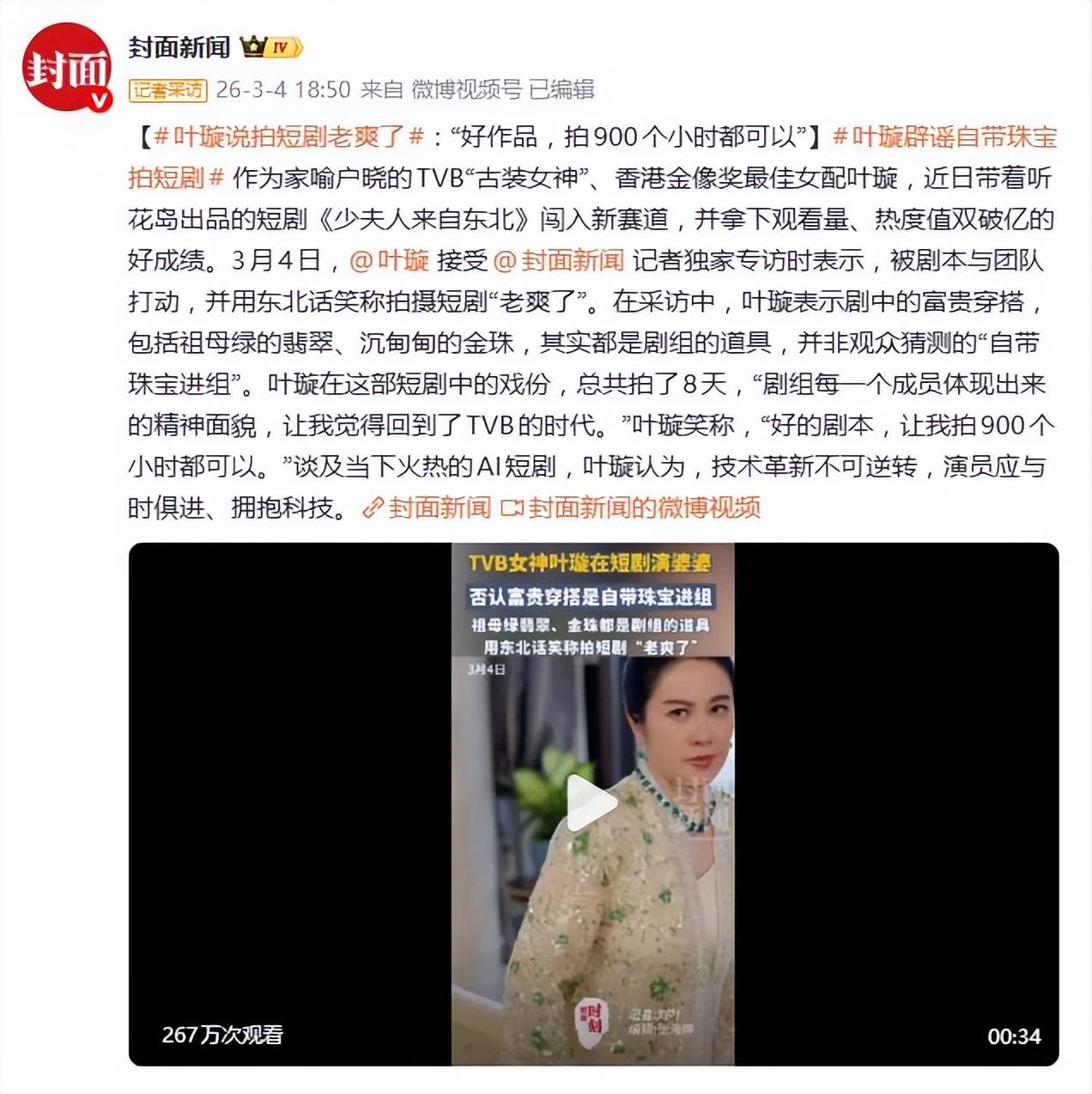 当然,争议也随之而来。不少网友唏嘘:昔日一线TVB花旦,如今却在短剧里演起了婆婆,对比同期佘诗曼等人仍在主演大制作,难免让人感慨“咖位”不再。对此,叶璇的回应相当清醒且犀利:“内容没有长短之分,只有好看和不好看。”她认为,短剧同样需要专业的演技支撑,并直言不排斥任何角色,“做妈妈也无所谓”,关键看剧本是否有发挥空间。