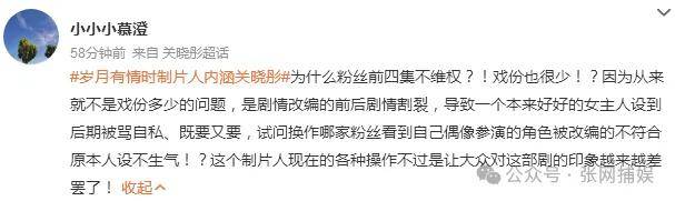 最后,来和捕娱姐聊聊:你觉得《岁月有情时》的戏份删减和人设魔改,是谁的问题?『制片人』暗讽『关晓彤』拿角不正,是不是太过分?粉丝维权真的没必要吗?