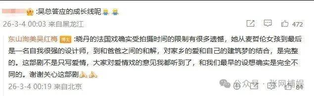 大结局当天,吴红梅还发文怒斥“捣乱的人”,觉得这些人在践踏主创团队的付出。可问题是,观众和粉丝的质疑,从来都不是“捣乱”,而是对创作的尊重——严晓丹的人设问题是客观存在的,这是剧方的创作失误,不是演员的表演问题,观众有权利指出问题,粉丝有权利为偶像的心血发声,这从来都不是“恩将仇报”。