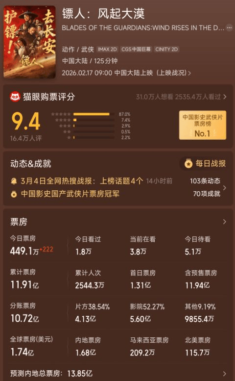 2025年开年,武侠电影市场迎来了一针强心剂。由『吴京』领衔主演的《镖人:风起大漠》(以下简称《镖人》)正在全国热映当中,截至目前累计票房已经突破11.89亿,专业平台预测总票房将在14亿左右收官。这一成绩在当下的电影市场中已属不易,但若按照圈内"三倍回本"的通行规则计算,这部成本将近7亿的大制作需要拿下21亿票房才能真正实现盈利,显然目前的票房数据还稍欠火候。