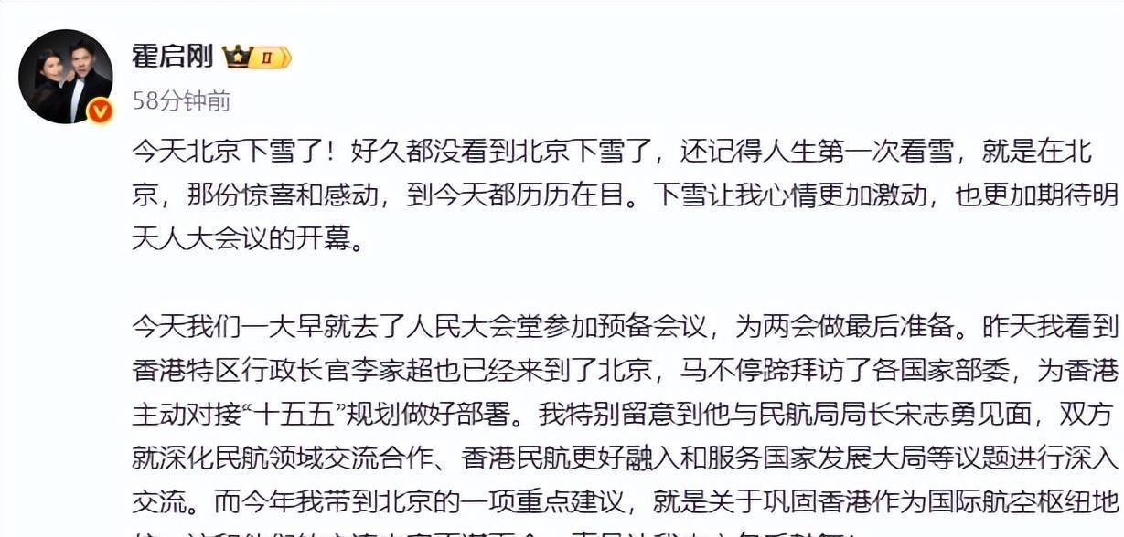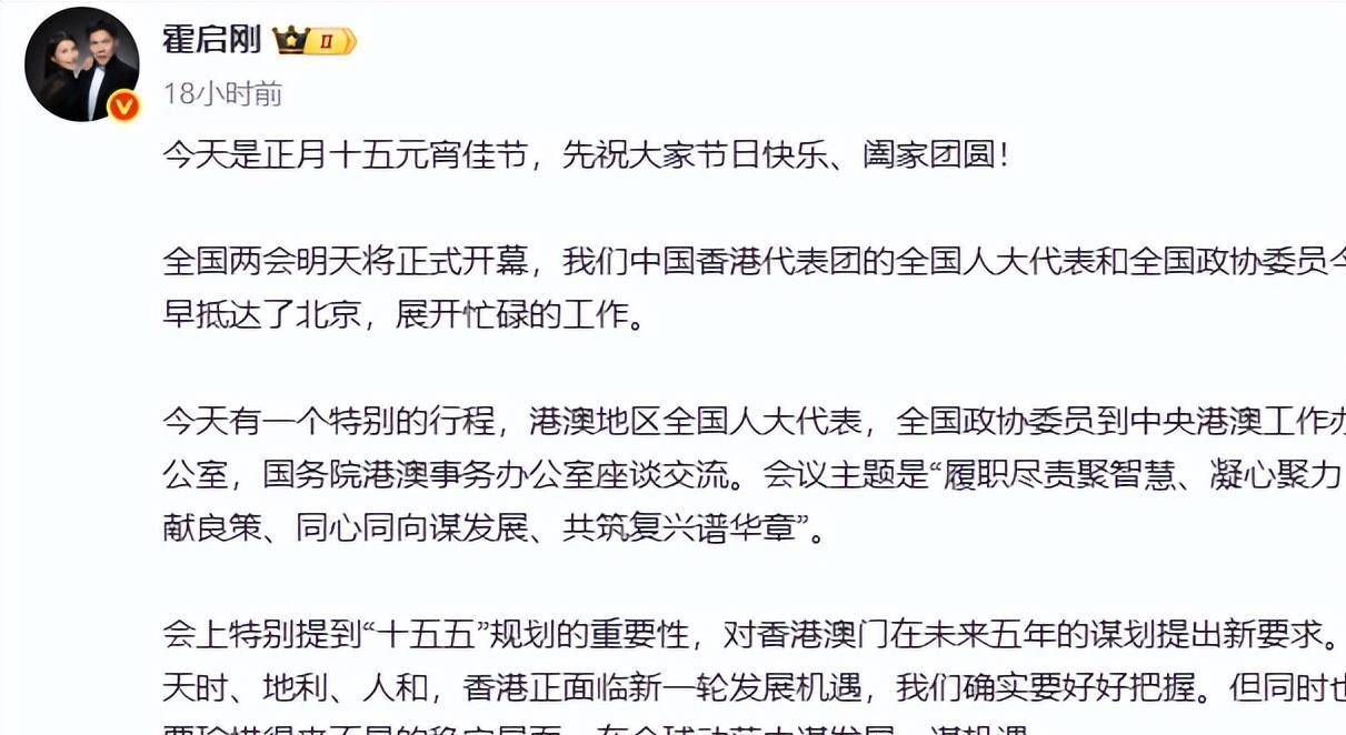 3月3号,元宵节,霍启刚跟着香港代表团到了北京。 他没晒代表证,没拍豪车,就在微博上写了一句:“今天是正月十五元宵佳节,先祝大家节日快乐、阖家团圆! ”
