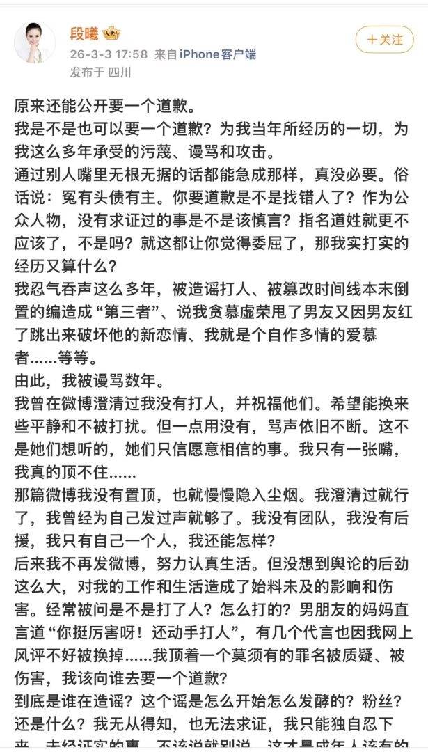 『张杰』20年前的前女友段曦迅速下场,长文控诉劈腿、上位、网暴;