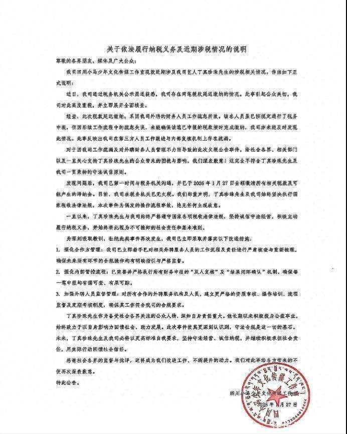 他从不争辩,哪怕面对误解与攻击,他始终把全部精力投入到实际的工作中。2026年初,由于工作室财务操作失误,产生了3.42万元税款延迟缴纳的记录,消息一经曝光,再度引发舆论风暴。有人指责他吸金无度,说他背弃初心。但丁真并没有做任何辩解,第一时间完成了全额补缴,并主动向税务部门提供了详细的说明材料。