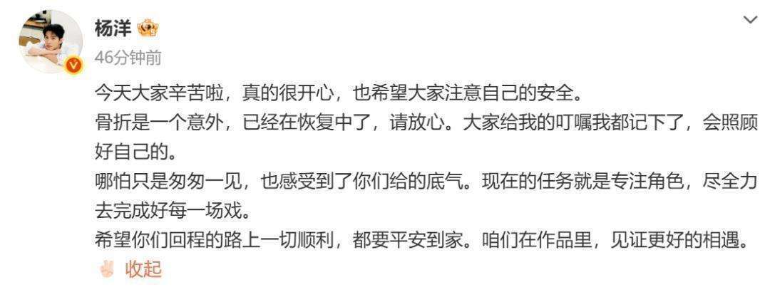 早在2月22日,『杨洋』就曾针对手部骨折发文回应,他写道:今天大家辛苦了,我很开心,也希望大家注意安全。骨折只是个意外,正在恢复,大家别太担心,我会好好照顾自己。他还坦言,即使只是短暂与大家见面,也能感受到大家给予的支持与鼓励。现在,他把全部注意力集中在角色上,尽心尽力地去完成每一场戏的表演。