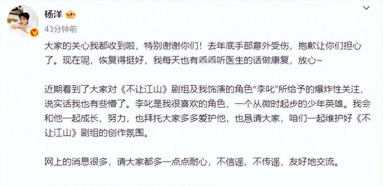 不让江山》在横店举行开机仪式时,『杨洋』手上缠着绷带或夹板,公开场面下的确显露出手部受伤的痕迹。在开机直播中,『杨洋』也向大家说明:现在正在恢复,请大家不要过于担心,我会好好恢复的。他感激粉丝一路的陪伴与支持,并表示会更加努力地塑造好每一个角色,同时配合治疗,不让大家过度担忧。尽管受了伤,剧组拍摄计划并未调整,『杨洋』饰演的主角🎭️李叱从开机当天起便全身心投入拍摄。