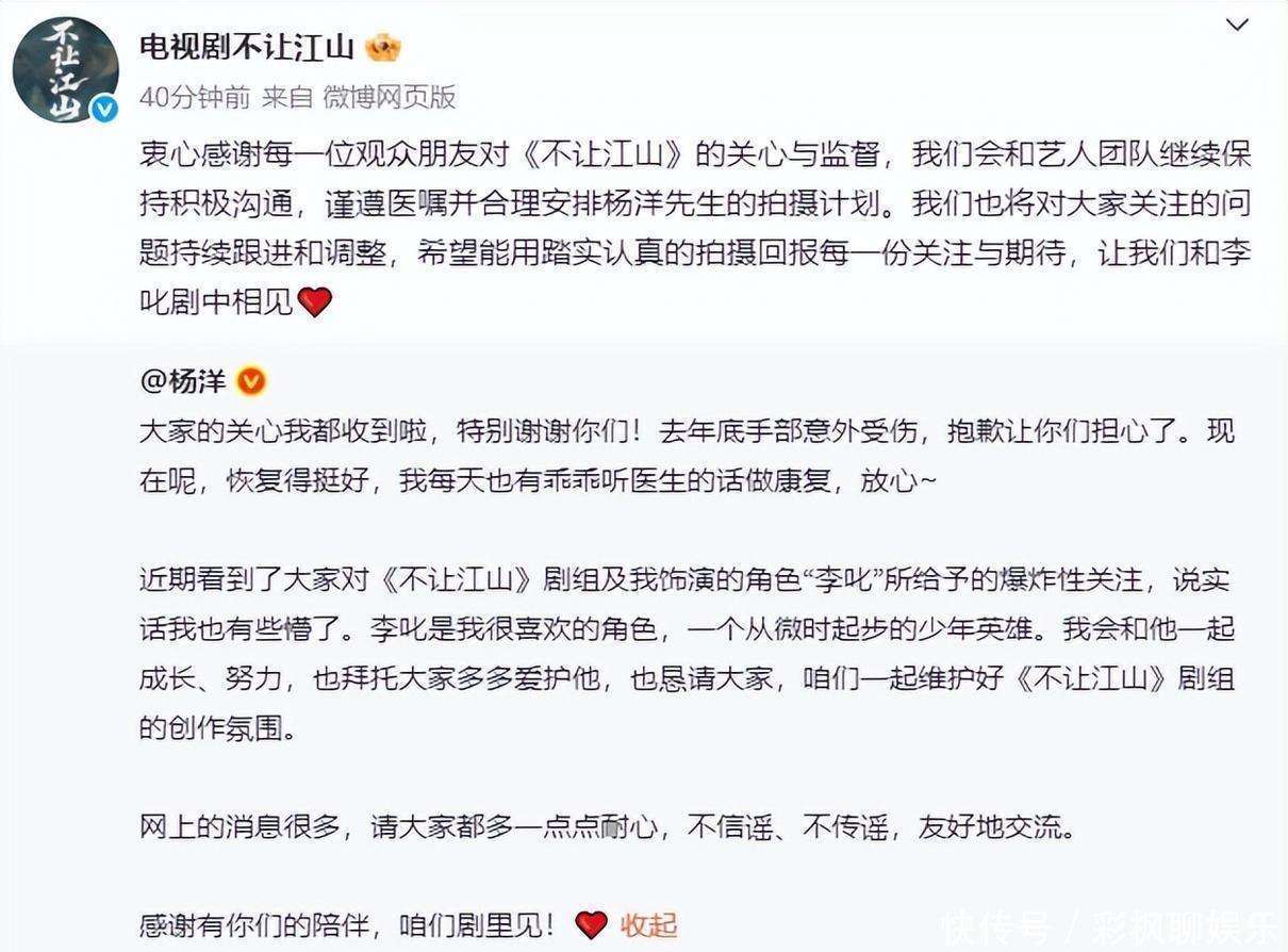 不让江山》官方账号也转发了『杨洋』的博文,并表达了诚挚的谢意:感谢每一位关注这部剧的观众,我们将与艺人团队持续沟通,按照医嘱合理安排『杨洋』的拍摄。对于大家关心的问题,我们会持续跟进并作出相应调整,用认真的拍摄回馈大家的期待,也期待在剧中与李叱再次相见。