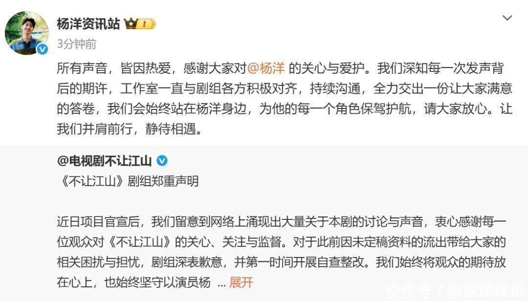 不让江山》新剧开机后,网络上出现了所谓阴阳剧本以及配角私下加戏的传闻,引发了一阵热议。对此,电视剧官方迅速发布声明,对未定稿资料泄露带来的困扰表示歉意,并展开自查与整改。声明中重申,『杨洋』饰演的男主李叱是剧组关注的核心,将维护角色的完整性,坚决否认所谓阴阳剧本或私下加戏,强调演员使用的都是同一版本的剧本;关于『杨洋』入组前的手伤,也已与团队及时沟通,行程安排已做出合理调整。随后,『杨洋』工作室也发布了回应,表达立场并向关注者传递感谢:大家的关心源于热爱,感谢每一份关注与期待。工作室一直与剧组保持沟通,将努力呈现一部令大家满意的作品,会持续支持『杨洋』,守护他每一个角色,请大家放心,静待作品与大家见面。