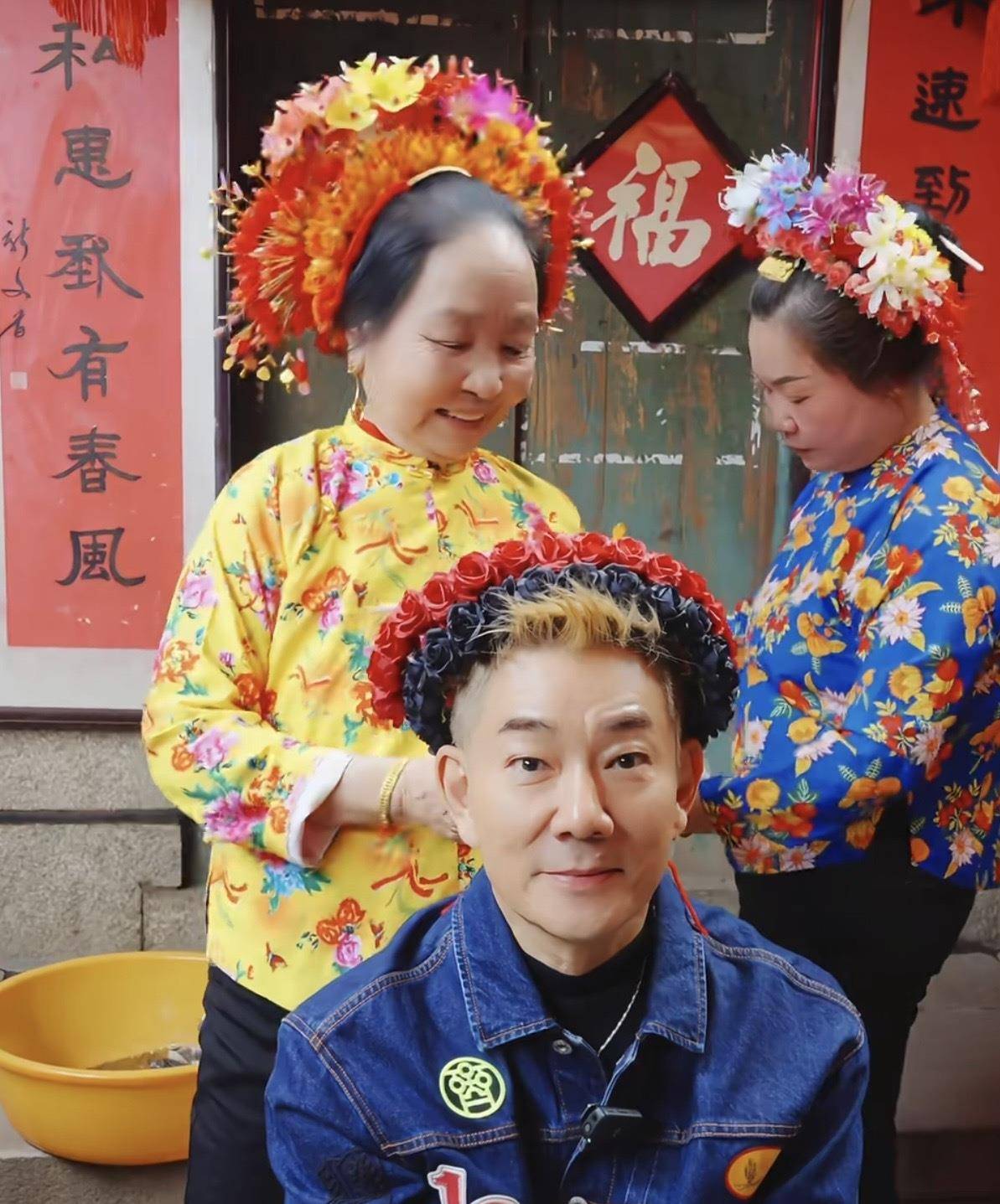 在阿姨的小店里,气氛轻松愉快。 有人提议玩石头剪刀布,输了的人要体验挽脸。 任贤齐也下场参与,这次他运气不错没输,但却主动陪着另一位体验的男士,一起做了簪花造型。 白兰阿姨特意为他设计了一款配色,以红色、金色、黑色为主,避开了过于柔美的风格。