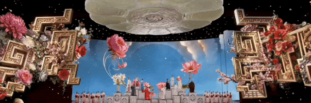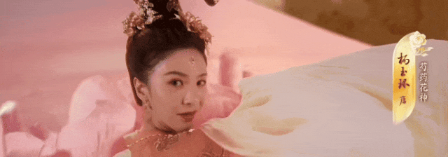 在《贺花神》中,杨玉环(唐诗逸 饰)对应四月芍药,被称为“花中宰相”。李白“云想衣裳花想容,春风拂槛露华浓”的诗句,写尽了她的雍容华贵。