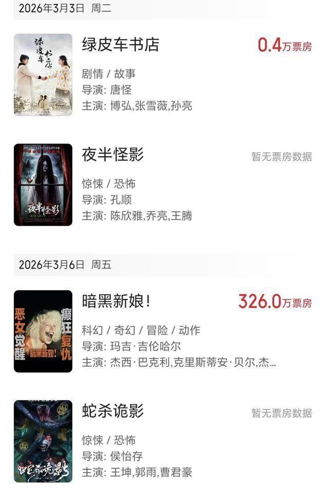 随后是于本月上映的两部恐怖片《夜半怪影》和《蛇杀诡影》,恐怖片在国内本来就不是很受欢迎,尤其是我们的国产恐怖片。而且《夜半怪影》和《蛇杀诡影》各自的导演和演员知名度都不是很高,影片本身也鲜有人知。在这种情况下,这两部恐怖片同样也都没有任何票房数据统计。