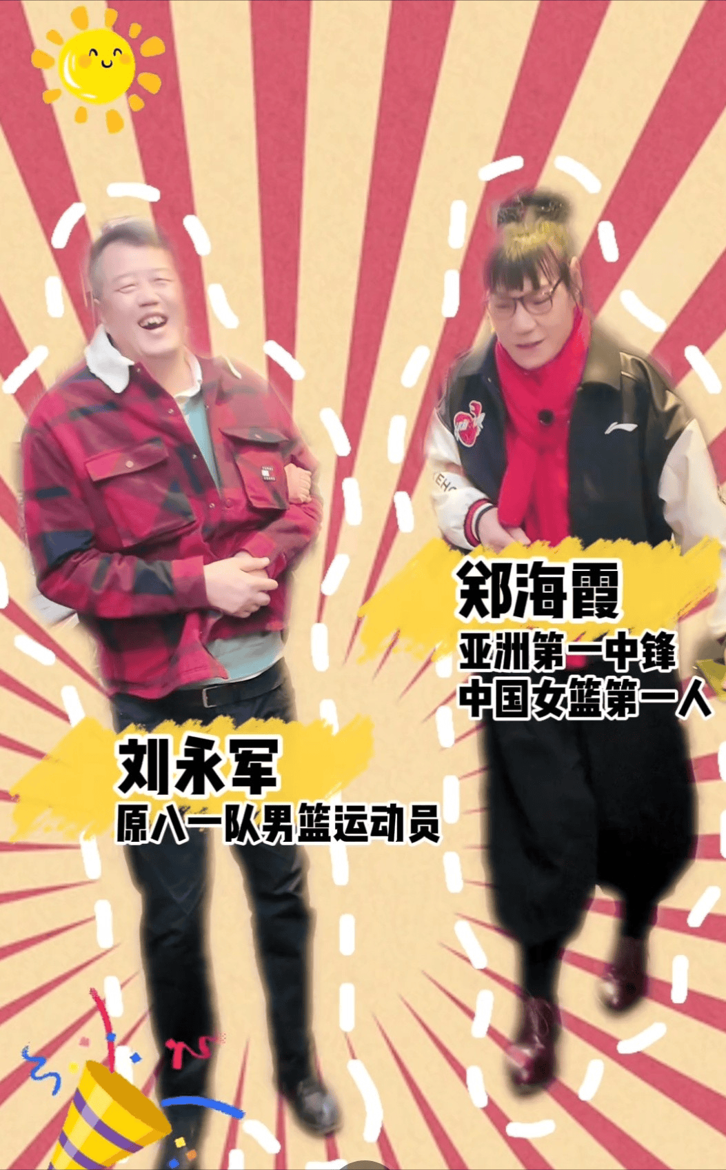 一个是陪几代人长大的少儿频道“蘑菇头”,一个是中国女篮的高个标志郑海霞,再加一个亲家公。三个人站一排,像把“年龄”“身高”“江湖辈分”同时拉满了。