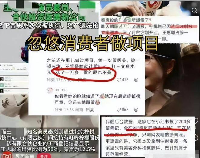 网友循着线索深挖,很快揭开了名为柠悦的医美公司的全部内幕。背后合伙人除了持股50%的大股东王思聪,还有演员『秦岚』和贾跃亭前妻甘薇。『秦岚』持股12.5%,成为机构最核心的宣传招牌,铺天盖地的推广打着『秦岚』同款的旗号,吸引了一大批冲着『明星』️效应而来的爱美人士。甘薇也紧随其后,不久前还在『直播间』卖力推介医美项目,变相为这家问题机构引流带货。