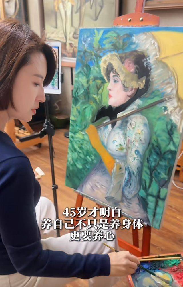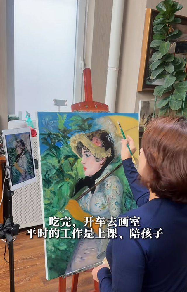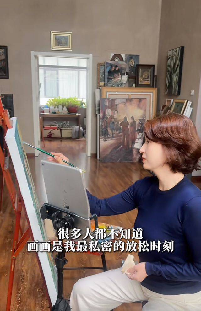 在画室里,张蕾身穿深蓝色长袖上衣和浅色休闲裤,端坐在画架前,神情专注,目光紧紧凝视着画布。她微微抿着嘴角,流露出对艺术创作的深深投入和享受。尽管她已接近50岁,但她的皮肤依然细腻光滑,仿佛自带一种自然的光泽,面部轮廓柔和,『妆容』淡雅,整体气质温婉知性。画架上的作品,是她临摹的爱德华·马奈的名作《