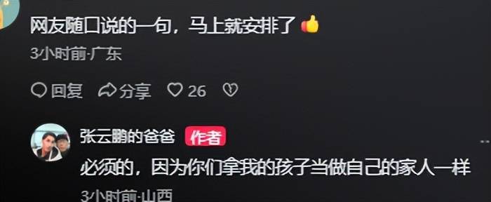 网友们纷纷称赞云鹏爸爸实在、接地气、太听劝了,而爸爸也真诚回应:必须听啊,你们把我的孩子当成自家人一样心疼。一句话里满满的感激之情,足以看出他对一直关心云鹏的网友们心怀感恩。