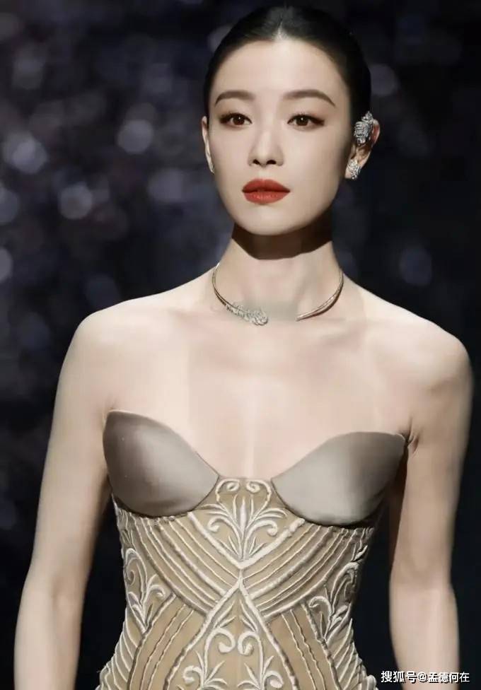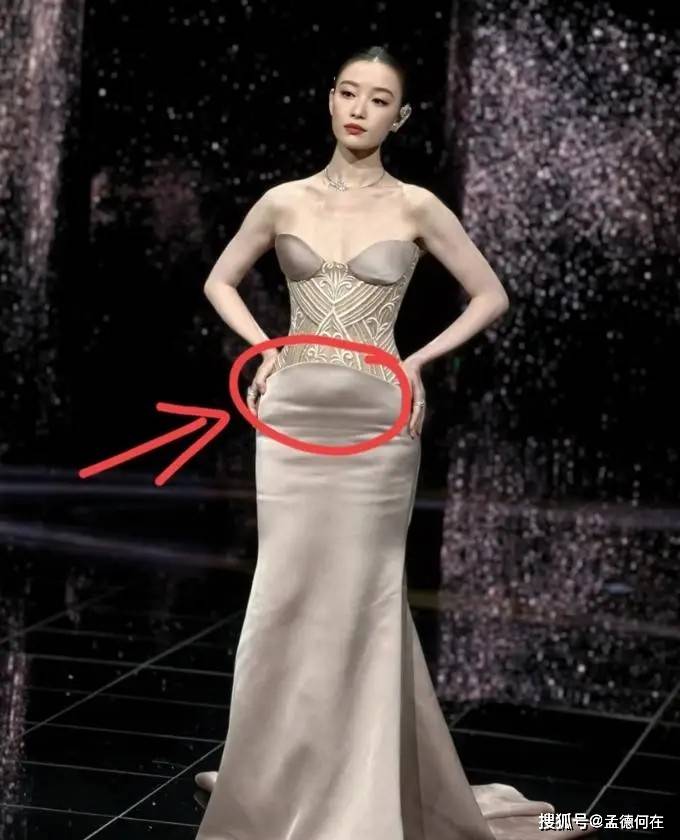 『倪妮』的礼服造型则略显普通,不够出众,整体感觉平稳,不太适合她,而且衣物还稍微凸显了腹部,不过她的腰线保持得不错,整体身形比例和谐。