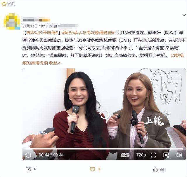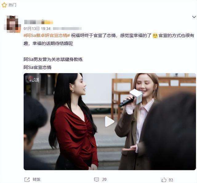 1月13日,『蔡卓妍』出席活动时,正值恋情传闻的风头正劲。当时有媒体传出她与33岁健身教练林俊贤正在热恋的消息。记者询问她是否承认这段绯闻,『蔡卓妍』的回应十分坚决,她轻松表示:绯闻二字可以去掉了。说这话时,她脸上洋溢着满满的幸福感,无法掩饰的笑容也让人感受到她的喜悦。