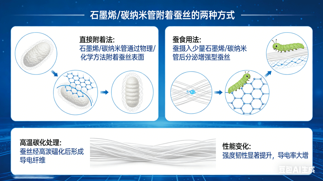 石墨烯和碳纳米管可通过多种方式附着于蚕丝表面,或让蚕食用少量此类物质,使蚕丝强度和韧性显著提升,经高温碳化处理后,碳化纤维导电率大增。