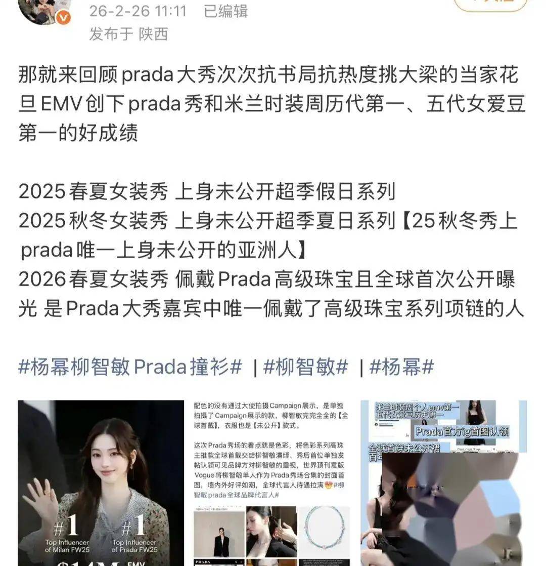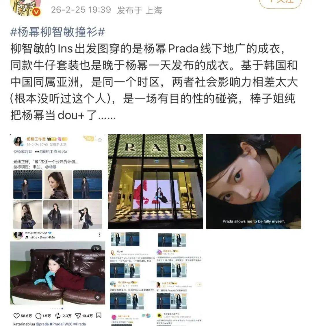 在看到两位女星的同款外套🧥后,粉丝们开始在网络上展开激烈的争论,双方的粉丝也分别组成了两派,一派是支持『杨幂』的粉丝,另一派则是支持柳智敏的粉丝。粉丝们的争论内容主要集中在两位女星的待遇和风格上,有粉丝认为『杨幂』的时尚资源远不如柳智敏,因此在时尚秀上的表现也会受到影响,而也有粉丝认为柳智敏的风格并不适合Prada,因此即使有更好的时尚资源,也未必能够在时尚秀上取得好成绩。