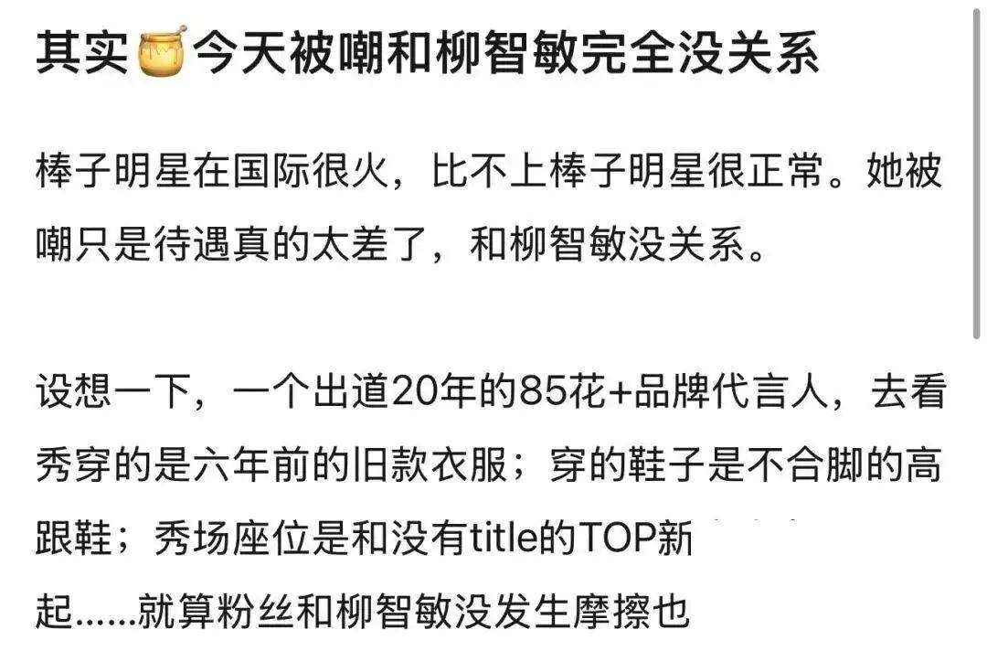 除了粉丝的争论之外,『杨幂』的出席待遇也受到了网友的质疑,有网友认为『杨幂』的时尚资源确实不如柳智敏,因为在时尚秀上,柳智敏不仅坐在了前排,而且还得到了知名时尚大佬的青睐,而『杨幂』则是被安排在了B区,这样的待遇差距确实让人感到意外,也让『杨幂』的粉丝感到非常不满,他们认为这样的待遇安排是不公平的。