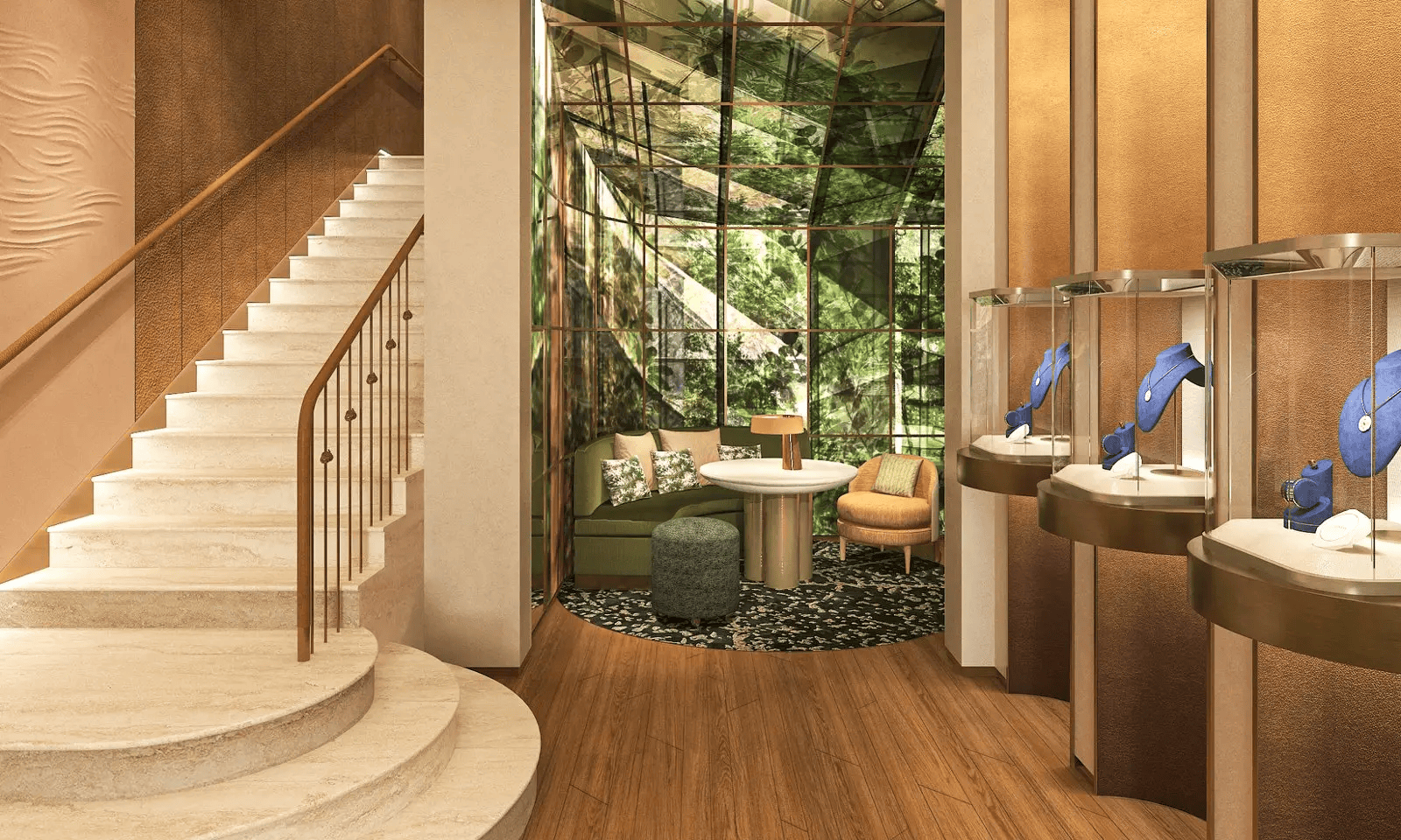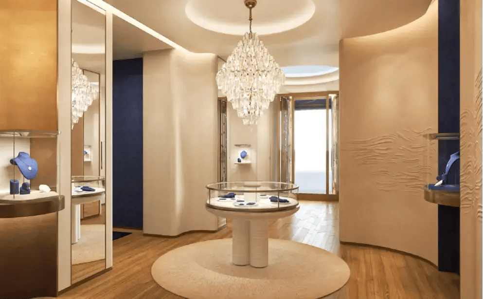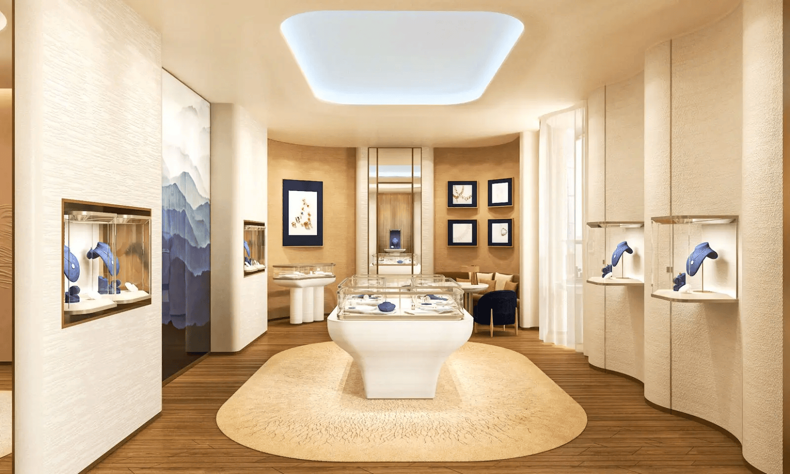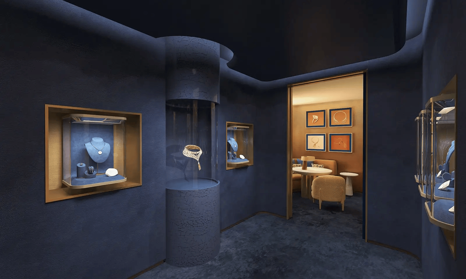 我们希望客人走进巴黎旗舰店时,感受到的是一段钻石的非凡蜕变旅程。入口处的枝形吊灯是由米兰 Venini 工坊手工打造的,灵感来自钻石原石的形态;店内还有一面大型金伯利岩墙,选用来自戴比尔斯矿区的天然金伯利岩,经过荷兰艺术家沃德·斯特鲁特曼(Ward Strootman)的创作,化身为镶嵌钻石粉末的艺术装置。整个空间的设计,从纳米比亚的蓝、博茨瓦纳的沙色,再到以葱郁的非洲景观为灵感的私密沙龙,都在呼应南部非洲的景致及色彩。另外,店内还特别打造了“英伦雅阁”(London Library)空间,向品牌的英伦文化根源致意。我们的战略是强化品牌的核心形象,因此这一空间概念将逐步推广至全球:首站将会落地香港,随后延展至纽约。