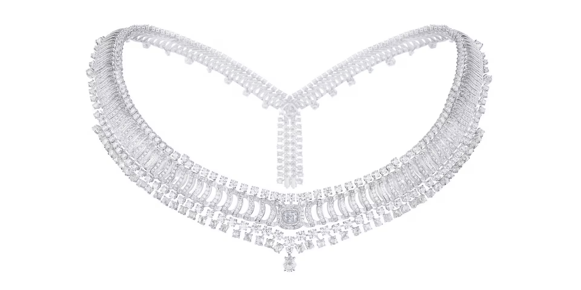 Echo 钻石项链镶嵌了一颗 1.12 克拉浓彩蓝钻,来自 Natural Works of Art 大师美钻系列,采自纳米比亚,是地球上最稀有的珍宝之一。整件作品使用了超过 193 克拉的圆形及梯形切割白钻,每一颗梯形切割钻石都采用了随形切割工艺(taille sur oeuvre),就是根据已有金属底座形态确定钻石的最终形状,让钻石与设计中的循环图案精准契合。Echo 钻石项链的铰接结构非常精巧,佩戴时像流水一样自然垂在颈间,而且可以灵活转换为六件独立且各具特色的珠宝:项链前段拆下可转换为一顶现代风格冠冕,其余部分以一条原钻与抛光钻石交织的手链相连,搭配的两条可拆卸流苏也可以取下转换为耳环佩戴。这是我们第一次呈现这么复杂的工艺,也体现了品牌在艺术美学、可持续发展理念及高级珠宝工艺领域不断突破的追求。