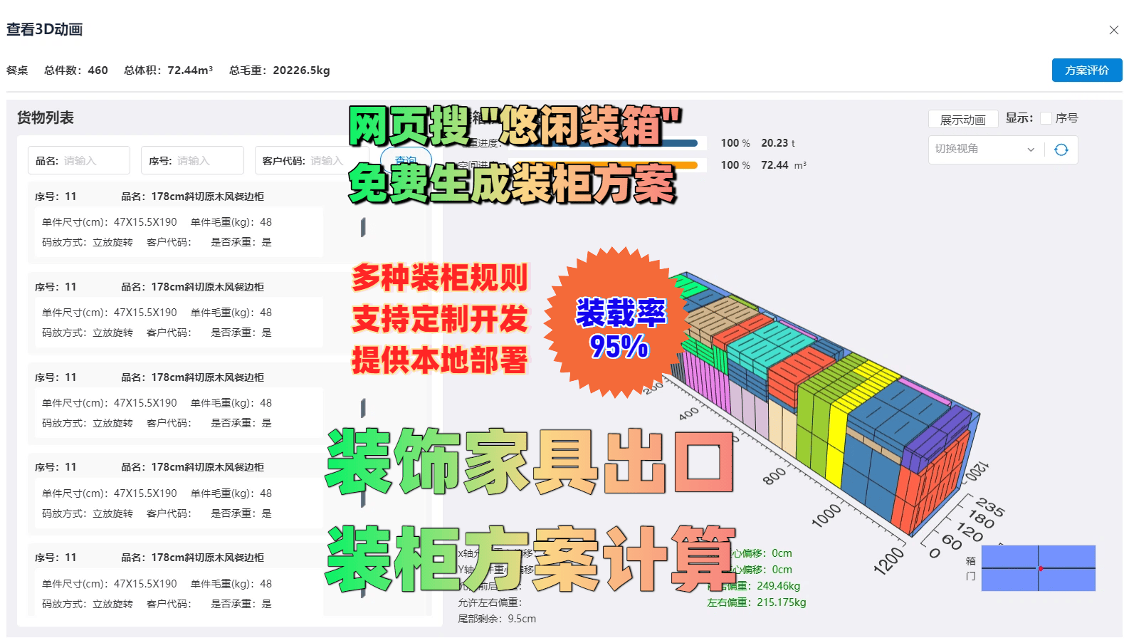 “悠闲装箱软件”在此类复杂家具混装中体现出明显优势: