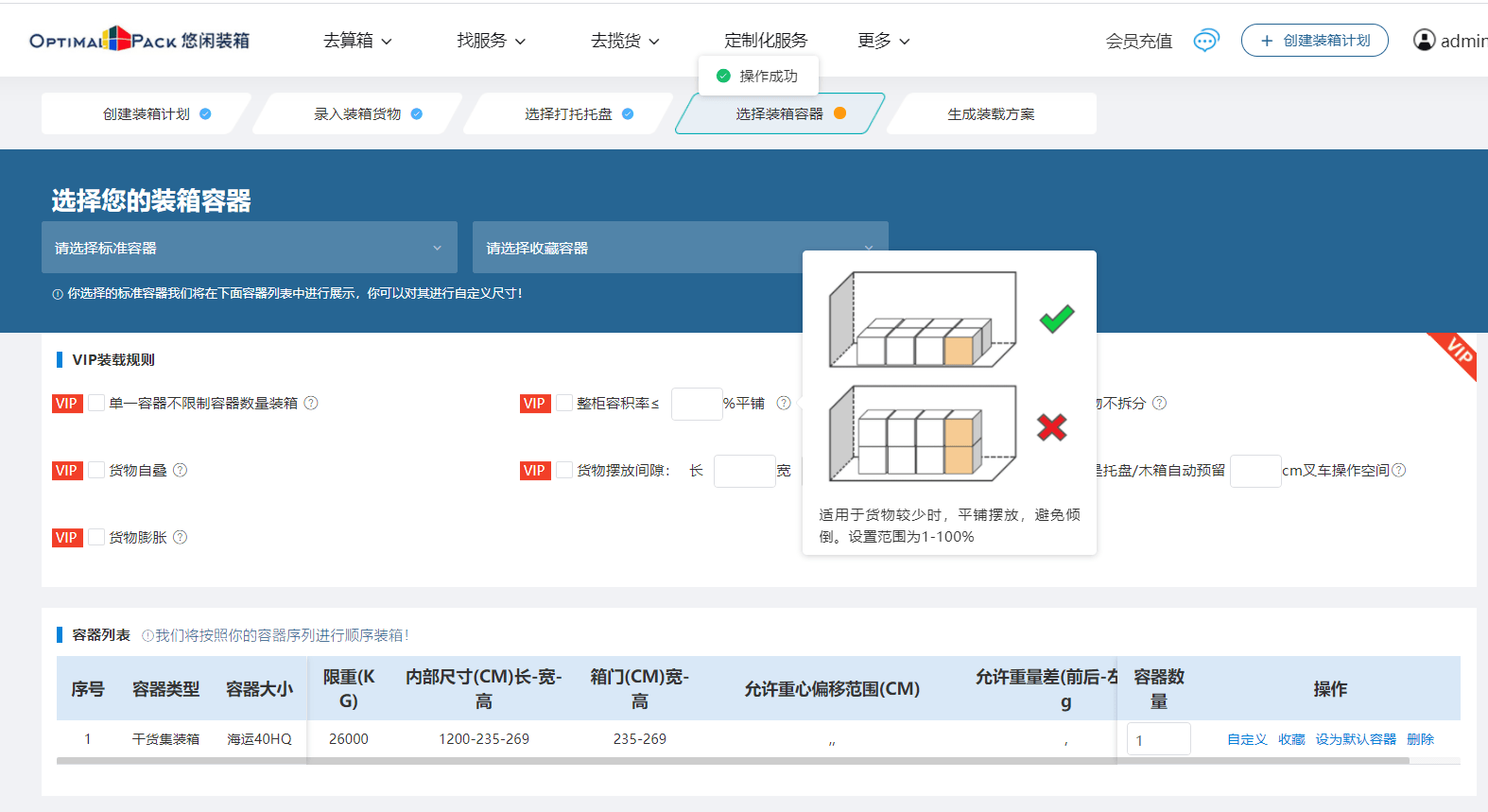 支持设置:最大堆叠层数、禁止倒置、相邻摆放、配套装载、不同运输模式规则;在保障安全的前提下优化装载率。
