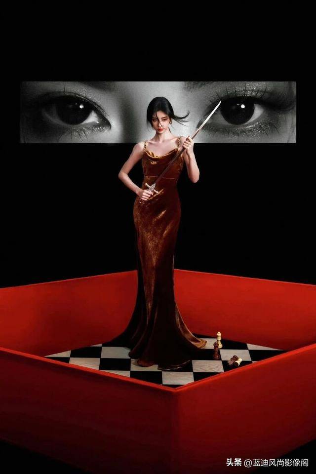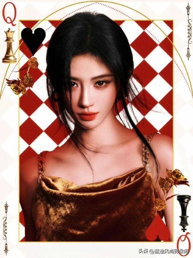 更难得的是,她的配饰与道具选择,完全做到了「点睛不抢戏」,和 “鎏金玫瑰” 的主题严丝合缝。没有堆砌满钻珠宝博眼球,只在肩颈处点缀了同色系的金色玫瑰叶片造型配饰,和礼裙的鎏金光泽温柔呼应,既填补了吊带款式的留白,又给华贵的礼裙添了几分浪漫的玫瑰氛围感;手持的权杖道具,和宫廷风的鎏金王座、红黑撞色的背景完美契合,没有硬凹女王的刻意感,反而让整套造型的故事感瞬间拉满 —— 她不是穿着礼裙摆拍的模特,是手握权杖、自带锋芒的红桃女王。