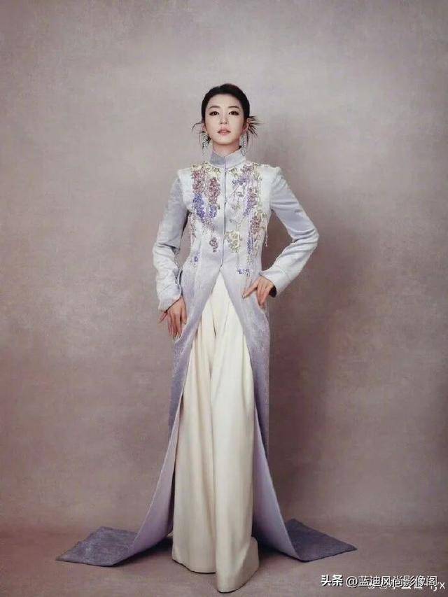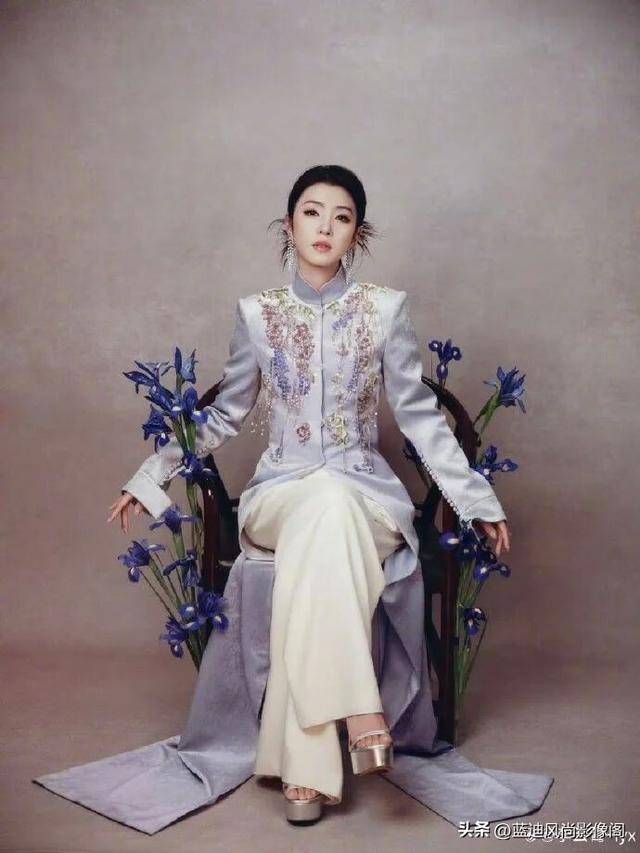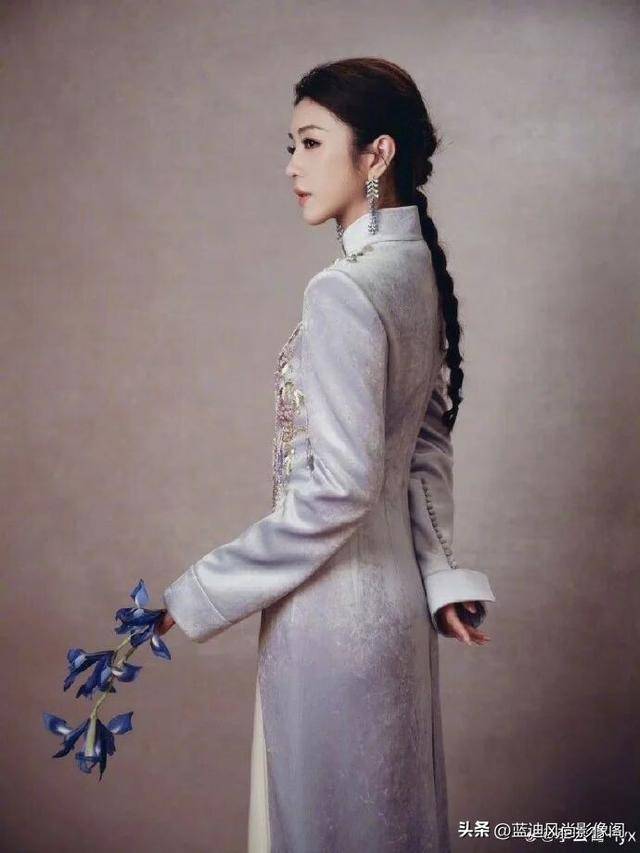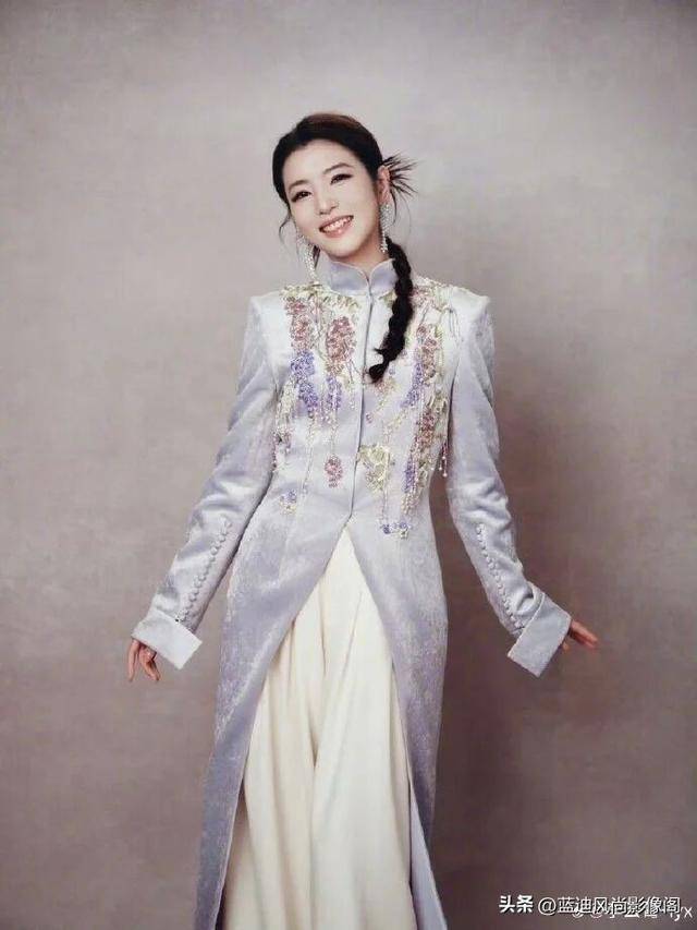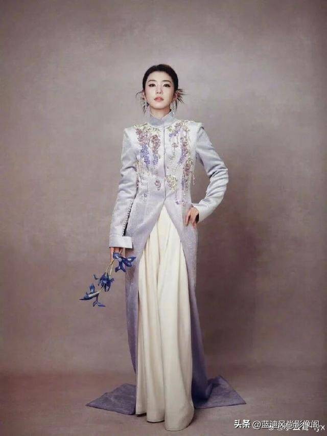 浅银灰的哑光缎面面料,更是选得恰到好处。它没有亮面缎子的浮夸扎眼,却在镜头里透着温润内敛的光泽感,不抢戏、不张扬,完美适配央视晚会的庄重氛围,又不会因为色调过浅显得寡淡沉闷。前襟错落排布的紫藤与鸢尾刺绣,是整套造型的灵魂 —— 不是满铺的重工绣纹,是像工笔画一样细腻晕开的紫蓝渐变绣线,在浅银灰的底色上若隐若现,雅致又鲜活,彻底避开了国风刺绣最容易踩的甜腻、老气雷区。