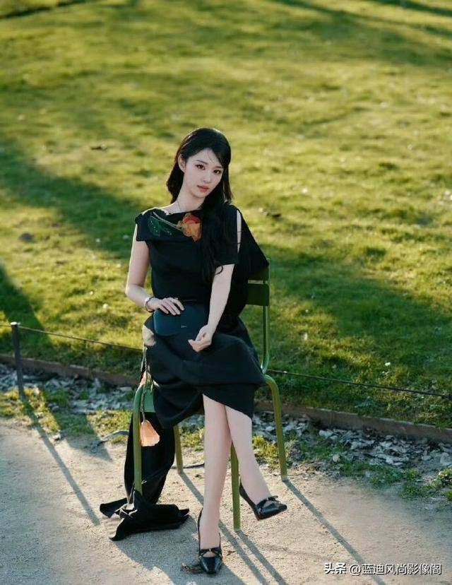 哑光垂坠的黑色面料,顺着身形自然流淌,没有用紧身剪裁硬凹曲线,反而用不对称的斜裁设计,勾勒出若隐若现的身形线条,露背的小心机设计,刚好露出她优越的肩背线条,不刻意露肤,却比夸张的深 V 更有氛围感。