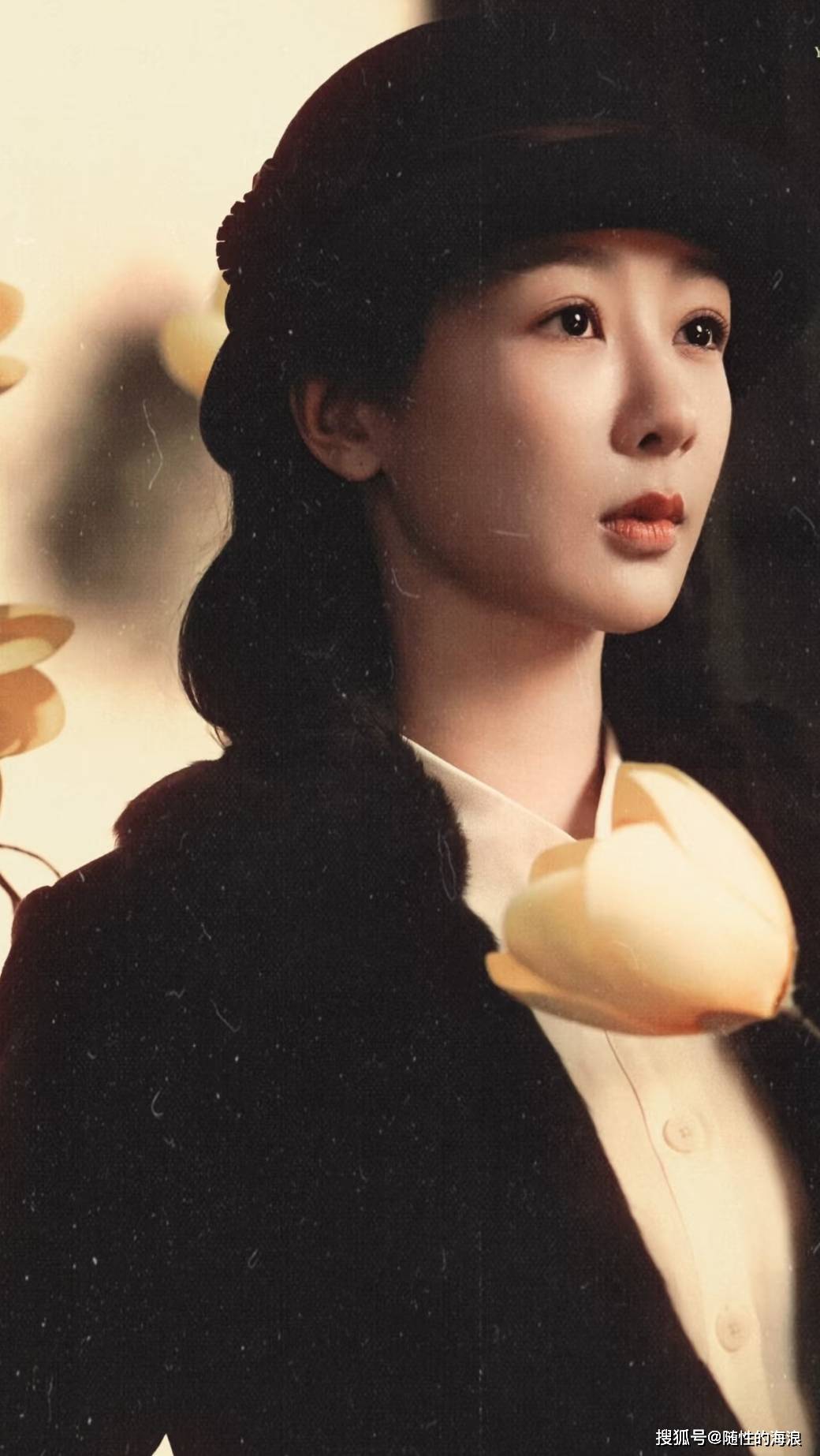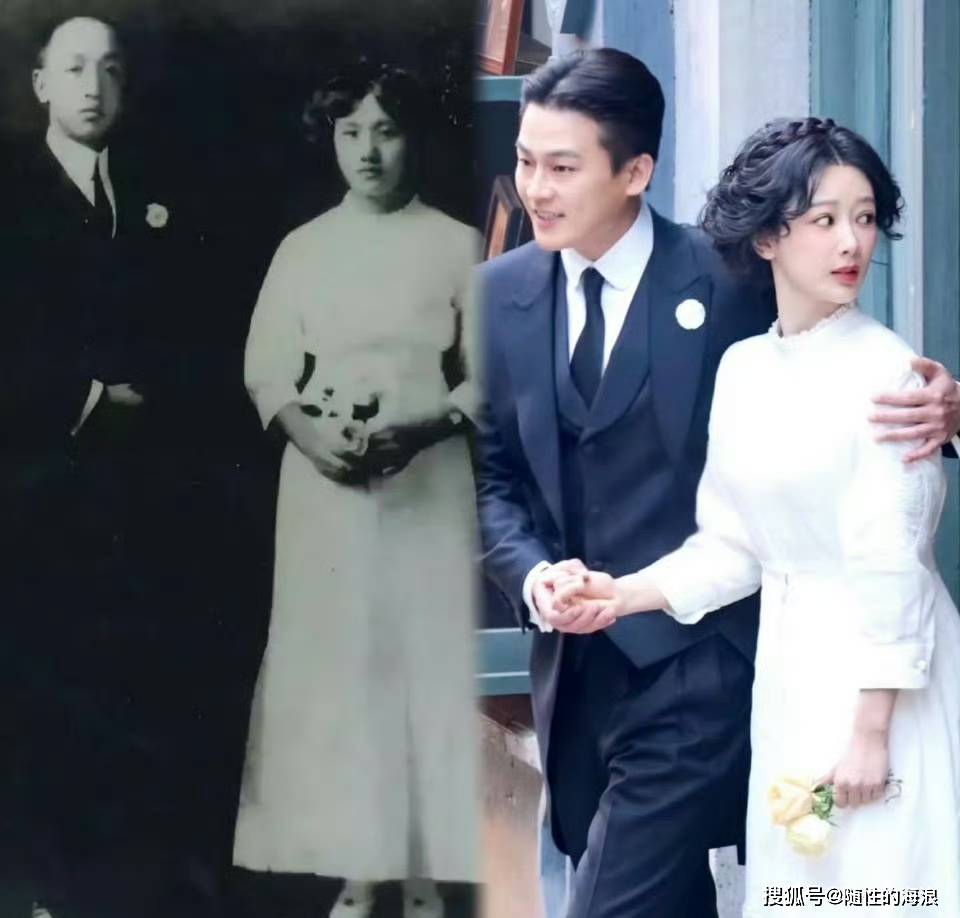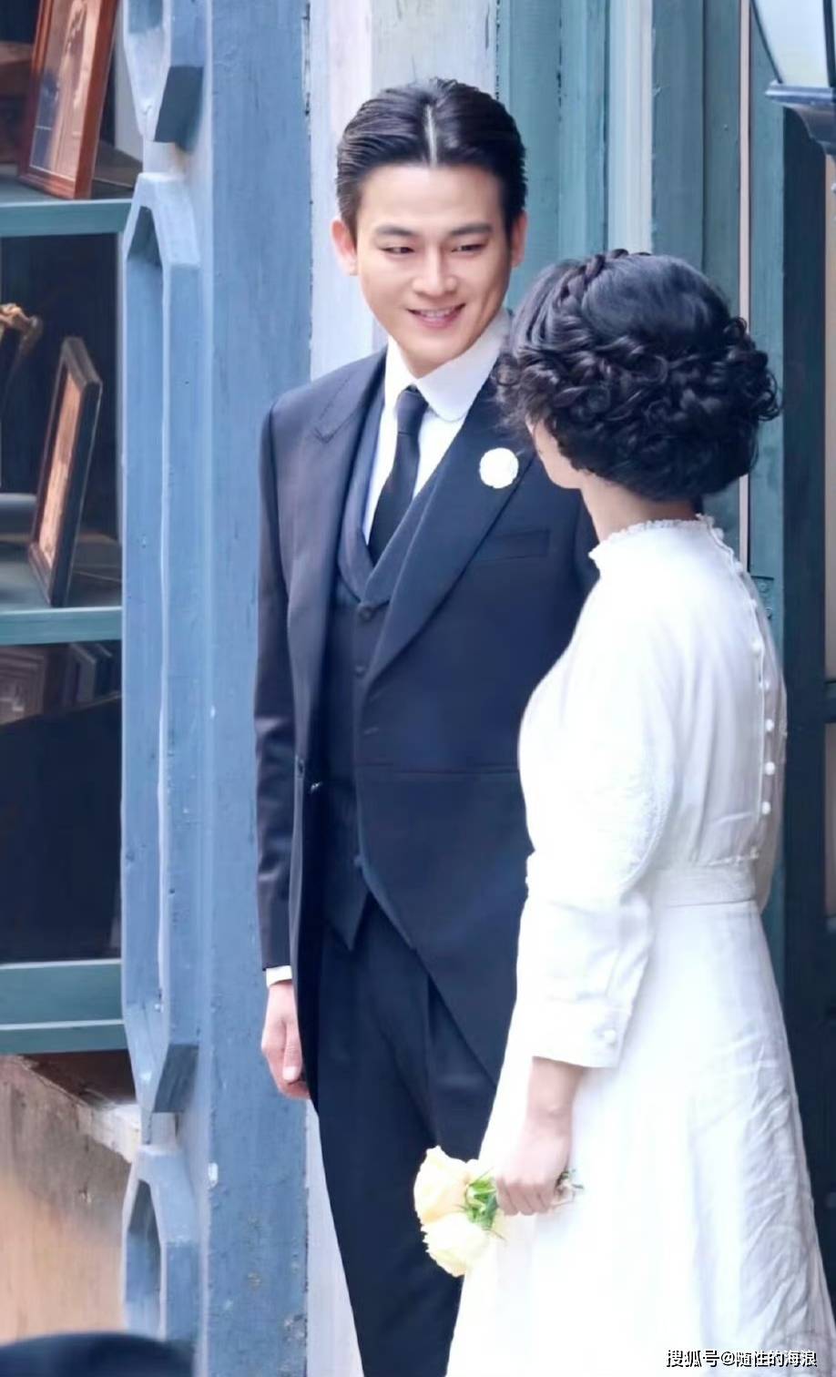 『杨紫』饰演的董竹君身着白色法式连衣裙👗,搭配复古发髻与手捧花,温婉典雅;欧豪饰演的夏之时身穿燕尾服,尽显民国绅士风范。