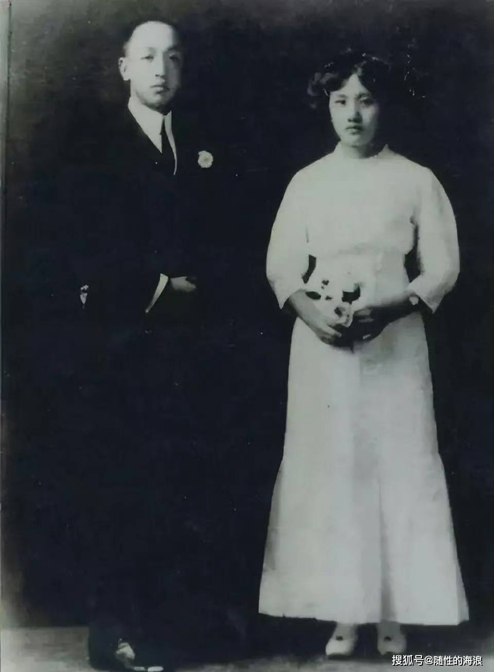两人造型严格参照董竹君自传《我的一个世纪》结婚照打造,服装、发饰、捧花全细节复刻,法式风格更贴合当时知识分子推崇共和思潮的时代审美,年代感与质感双在线。
