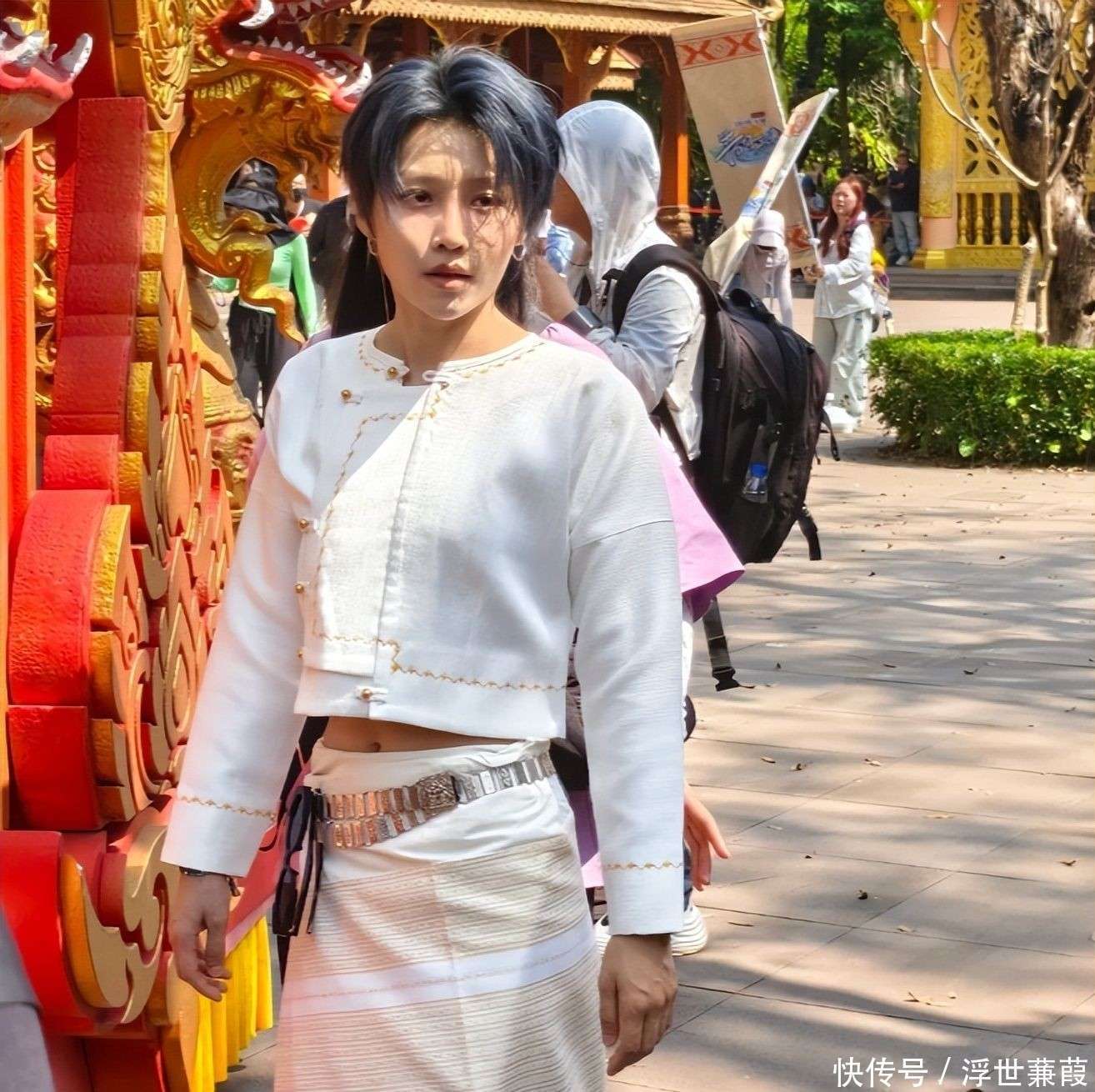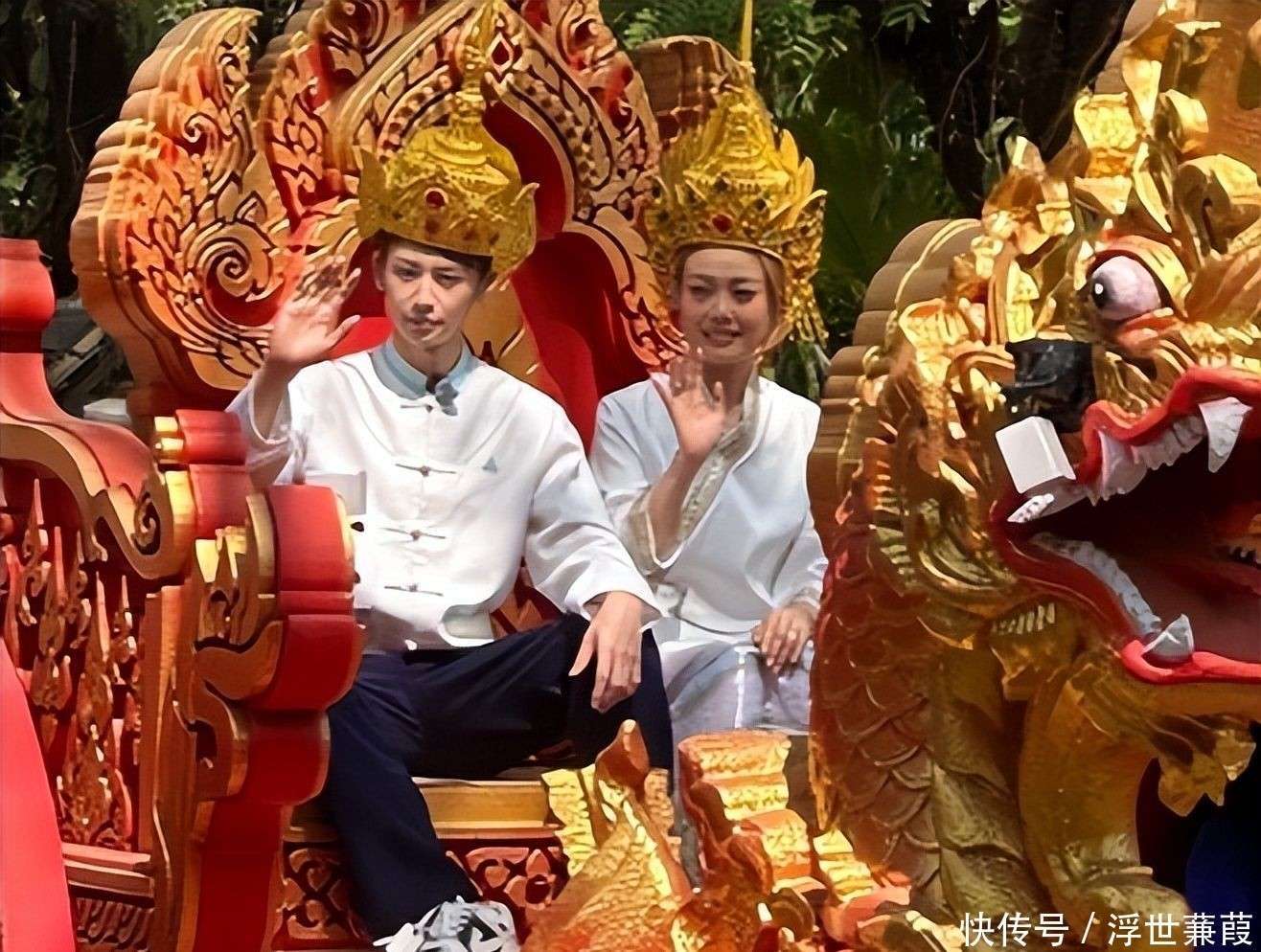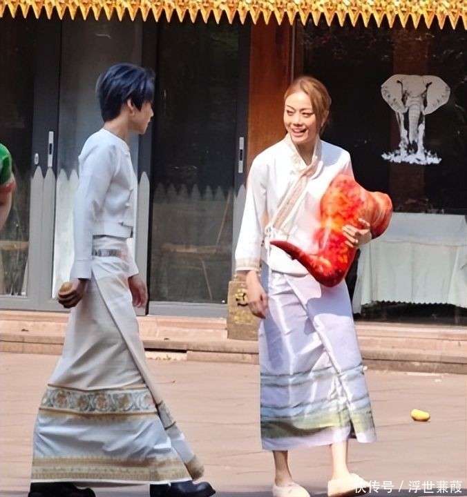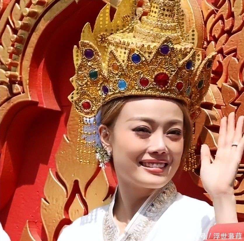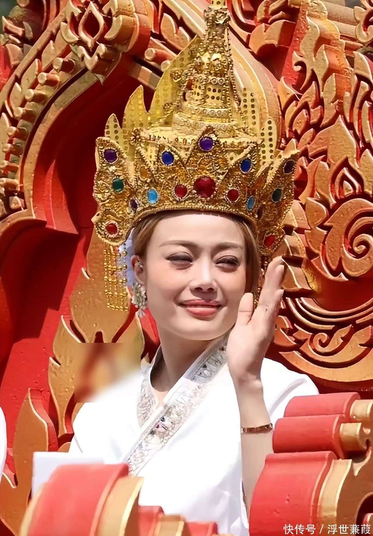 与小鬼的疲态形成鲜明对比的是容祖儿,她以截然不同的面貌带来了一丝暖意。她穿着一件融合了傣族元素的改良长裙👗,头戴小巧的金色皇冠,皇冠上的蓝宝石在阳光下闪烁着柔和的光泽,细节考究却又亲和,令人感到亲切。她的面部状态与往日的形象也有所不同:苹果肌微微丰盈,下巴线条略显宽松,少了几分曾经的冷艳感,多了一些邻家姐姐的亲和力。
