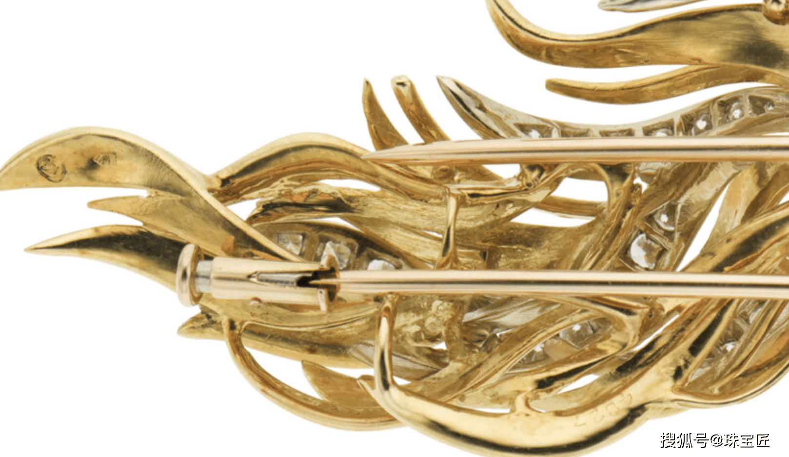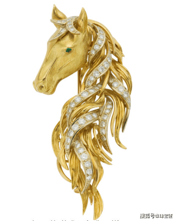 马元素在珠宝设计史上有着重要地位,象征着力量、优雅与社会地位。这枚体量不小的骏马胸针是一种 clip-brooch(夹式胸针),其结构允许佩戴者将其固定在翻领、围巾🧣或手袋👝上,这种多功能性是20世纪中期至后期珠宝设计的典型特征 。