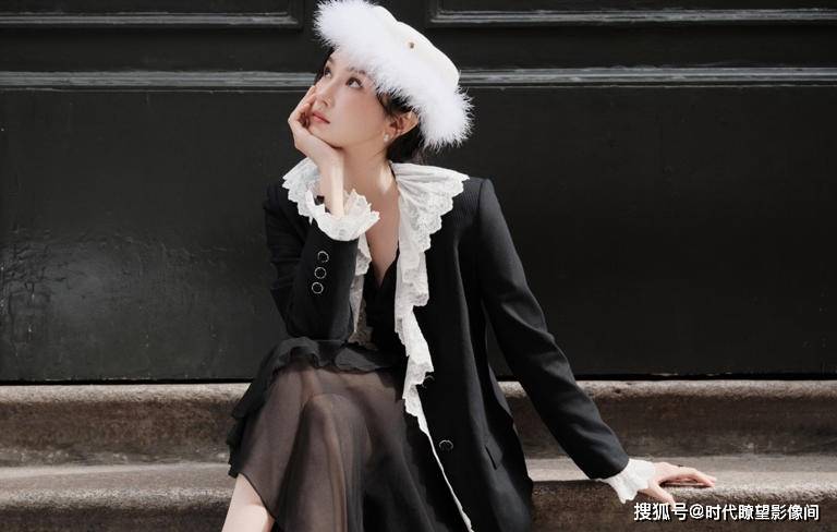 这套装造的精妙之处,就是把 “冲突美学” 玩到了极致 —— 黑西装是现代都市的利落感,羽毛贝雷帽和白蕾丝是老电影里的复古浪漫,俩看似八竿子打不着的元素,在陈小纭身上居然和谐得像天生一对,这种搭配可不是随便堆元素,是对经典的致敬和重塑啊!