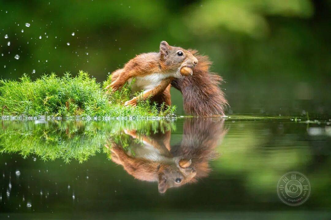一只松鼠在波光粼粼的水面上方跃起,嘴里紧紧叼着一颗坚果。画面静谧而葱郁,如镜般的水面倒影将这一瞬间的视觉效果加倍呈现。